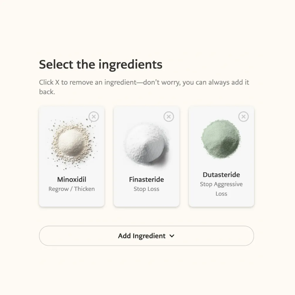 Choose from minoxidil, dutasteride, finasteride and biotin in any combination you like with our simple to use selector.